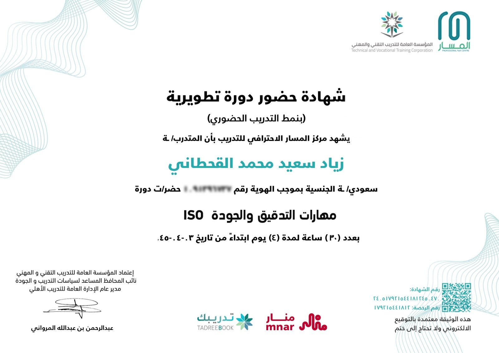 شهادتين معتمدتين، واحدة من المؤسسة العامة للتدريب التقني والمهني، والأخرى من مركز المسار الاحترافي
