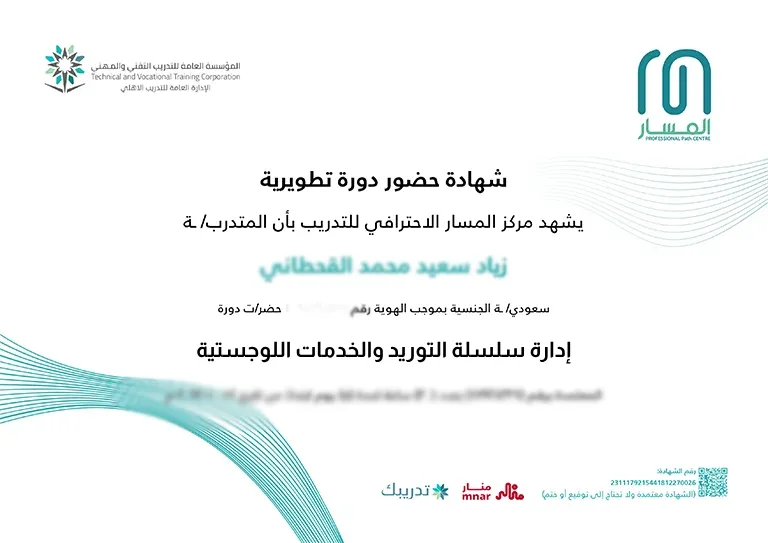 يحصل المتدرب في نهاية الدورة التدريبية على: